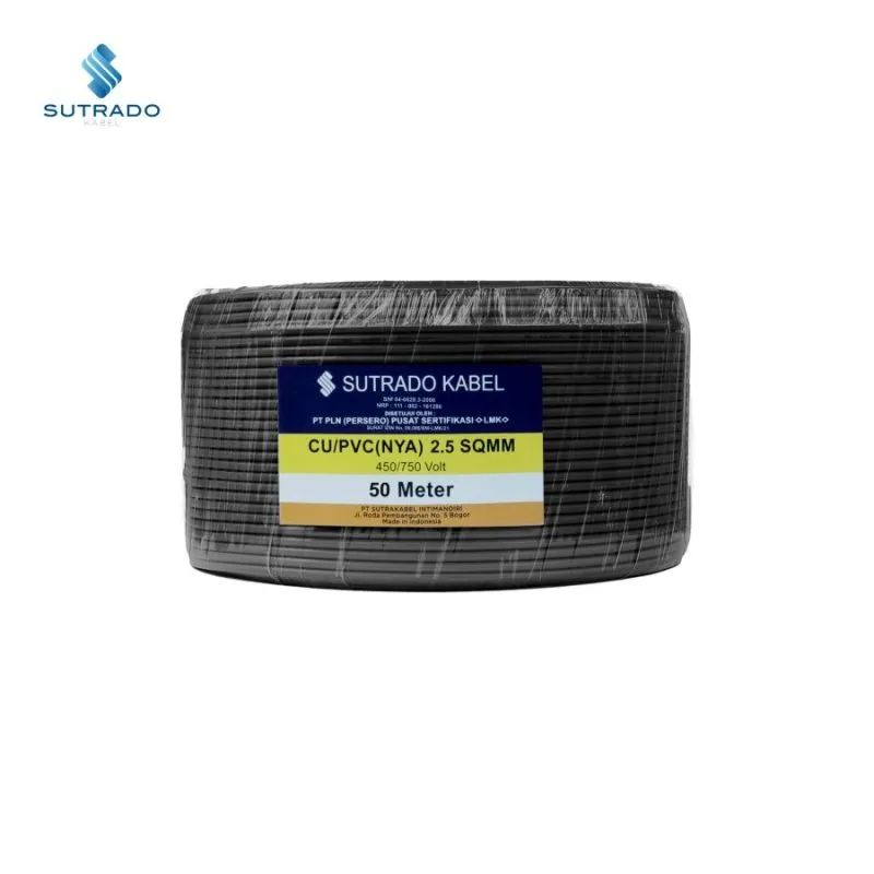 Sutrado Kabel NYA 1 X 2.5 mm adalah kabel inti tunggal dengan lapisan pelindung PVC yang digunakan untuk instalasi listrik indoor (tempat yang kering) dengan skala kecil contohnya untuk keperluan instalasi lampu maupun pemasangan stop kontak.