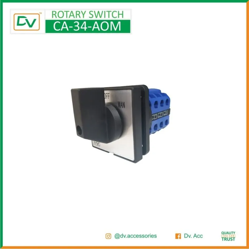 Selector Switch CA34-AOM Auto Manual berfungsi untuk memilih tegangan yang diinginkan, sebagai pemilih fungsi pengujian (Ohm, Volt, Ampere) pada Multimeter, Pemilih Suhu pada Oven dan lain sebagainya.
