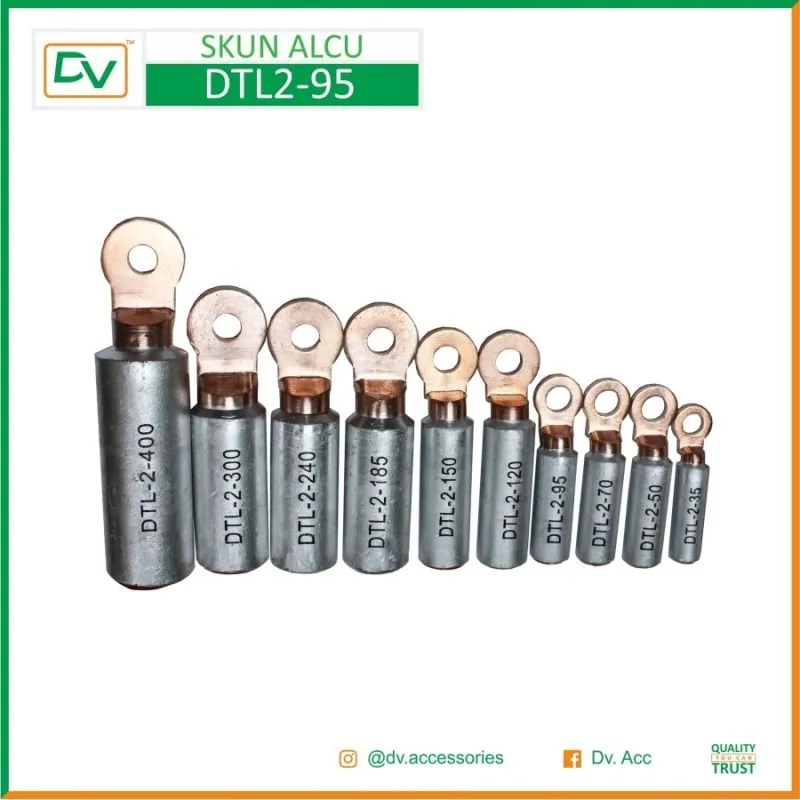 Skun Alcu DTL2-95 95mm merupakan alumunium barrel pada CL skun AL CU Bimetal dilapisi dengan minyak grease sehingga tidak mudah oksidasi. Skun Kabel BImetal AL CU ber fungsi untuk digunakan sebagai penyambung dan koneksi antara kabel alumunium dengan alat listrik berbahan tembaga / cooper.