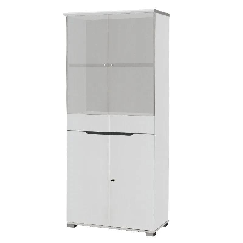 Lemari 4 pintu model ayun, terdiri dari 2 pintu kaca pada bagian atas dan 2 pintu besi pada bagian bawah. Gagang pintu lemari ergonomis, memudahkan membuka dan menutup lemari. Terdapat 5 rak dengan ketinggian setiap rak dapat disesuaikan kebutuhan.