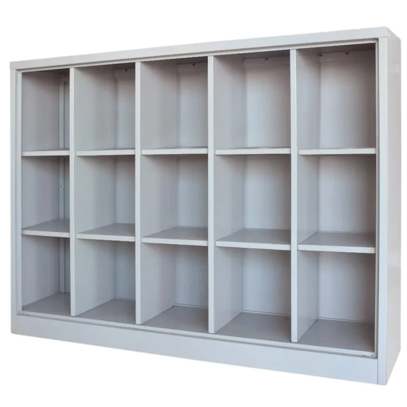 Rak didesain ukuran khusus untuk menyimpan tas sekolah dan memajang hasil karya siswa . Berbahan metal, warna grey, dengan type knock down.