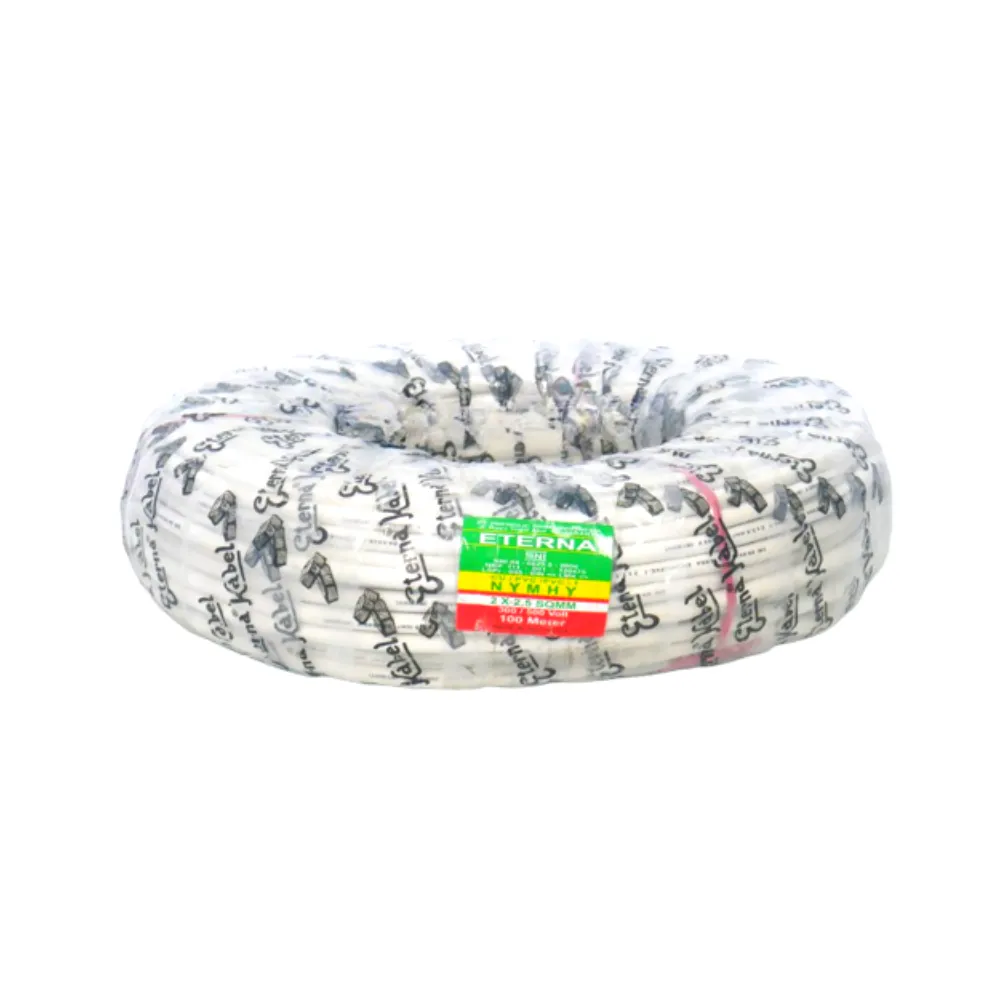 Eterna Kabel NYMHY 2 X 2.5 mm sangat fleksibel dan tidak mudah patah pada umumnya digunakan untuk instalasi di dalam rumah yang tidak permanen seperti penghubung alat elektronik rumah tangga yang pindah-pindah . Memiliki inti tembaga berbentuk serabut dengan pelindung lapisan isolator yang aman bagi jangkauan manusia.
